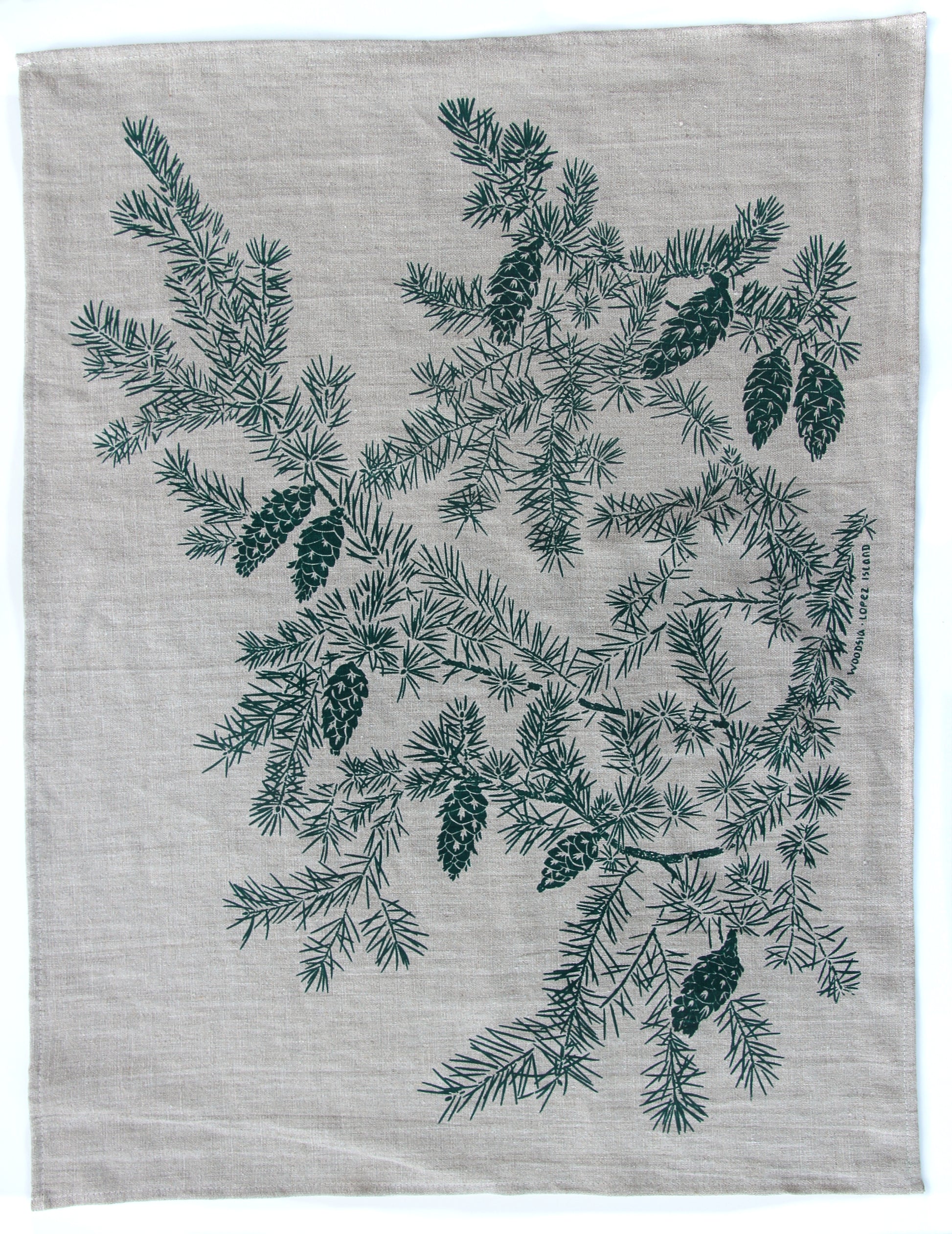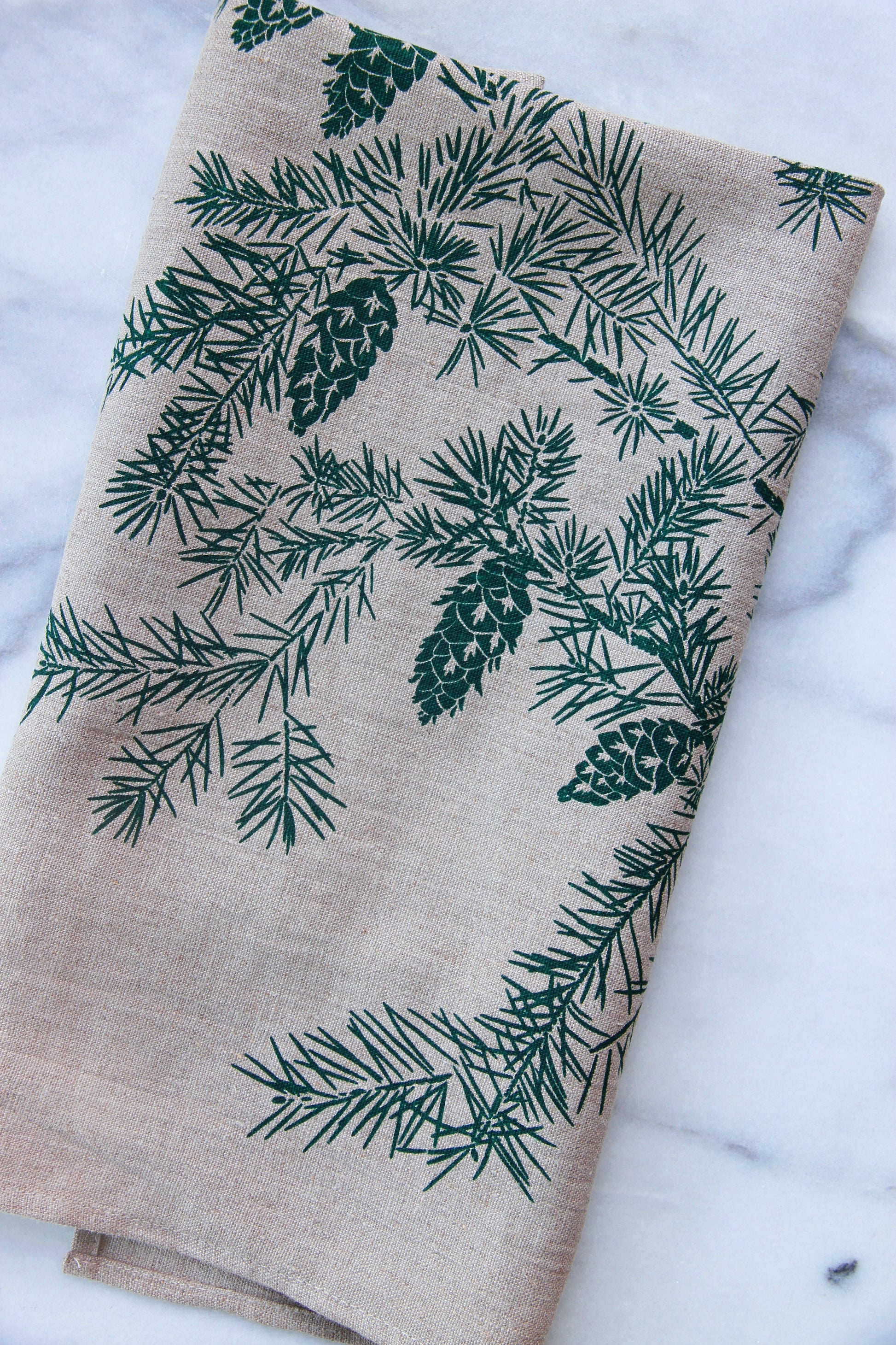 Douglas Fir Kitchen Towel in Hunter Green on Natural Linen