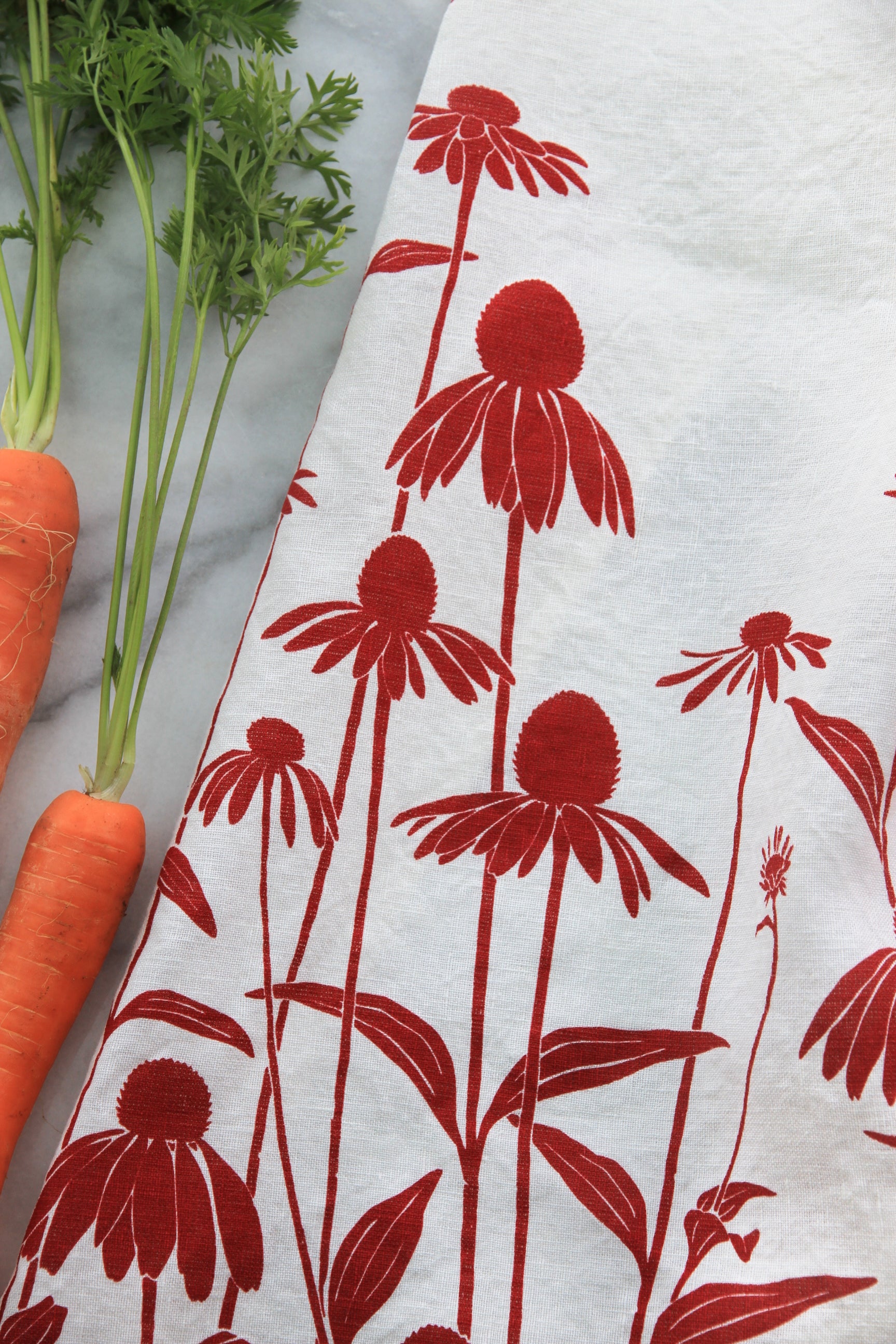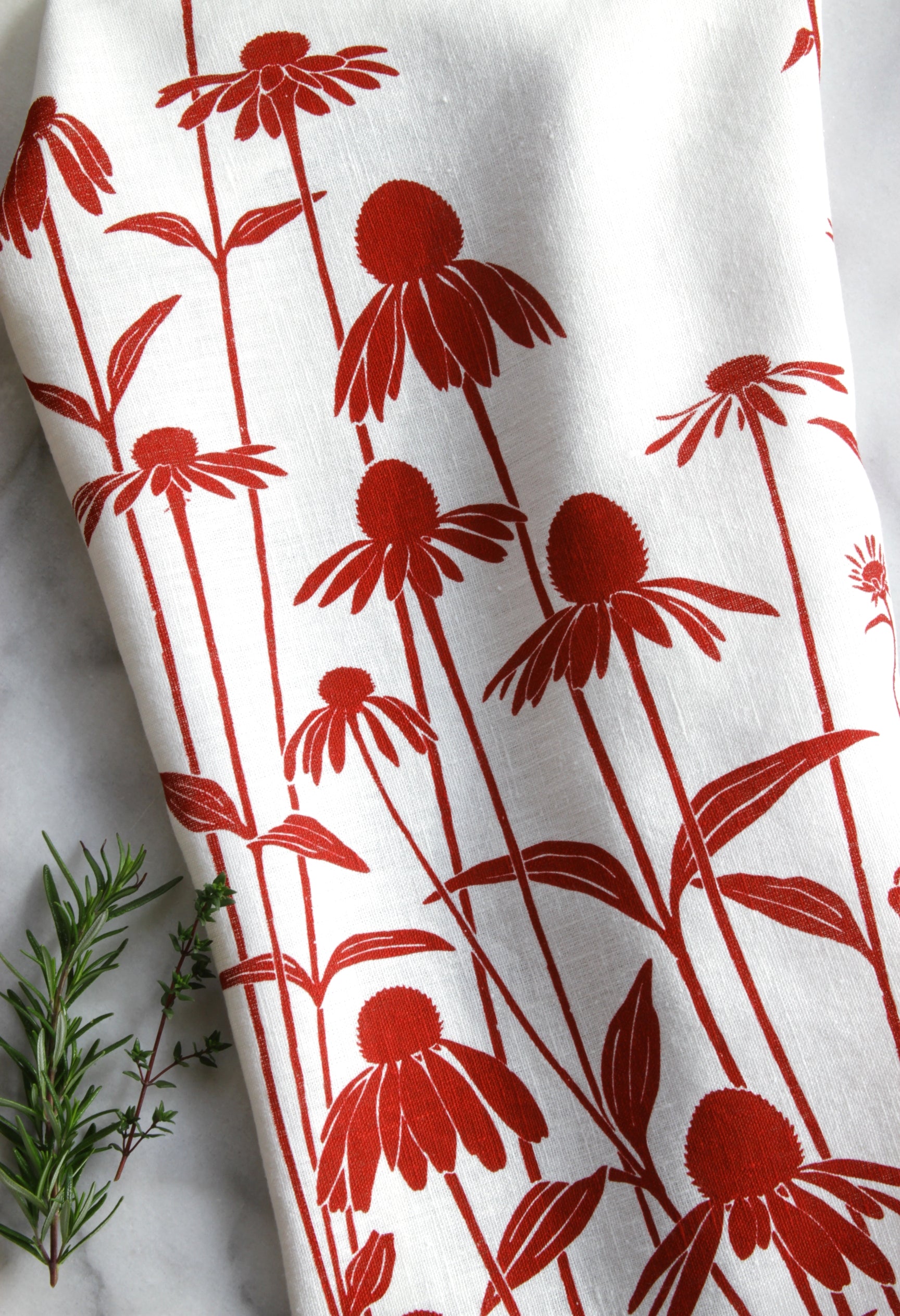 Echinacea Kitchen Towel in Raspberry on White Linen