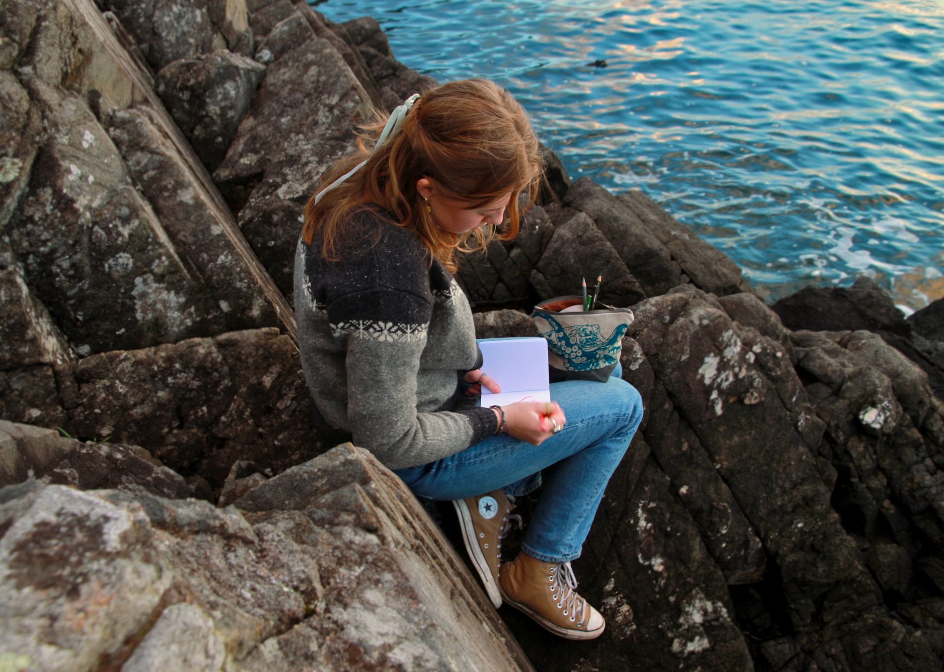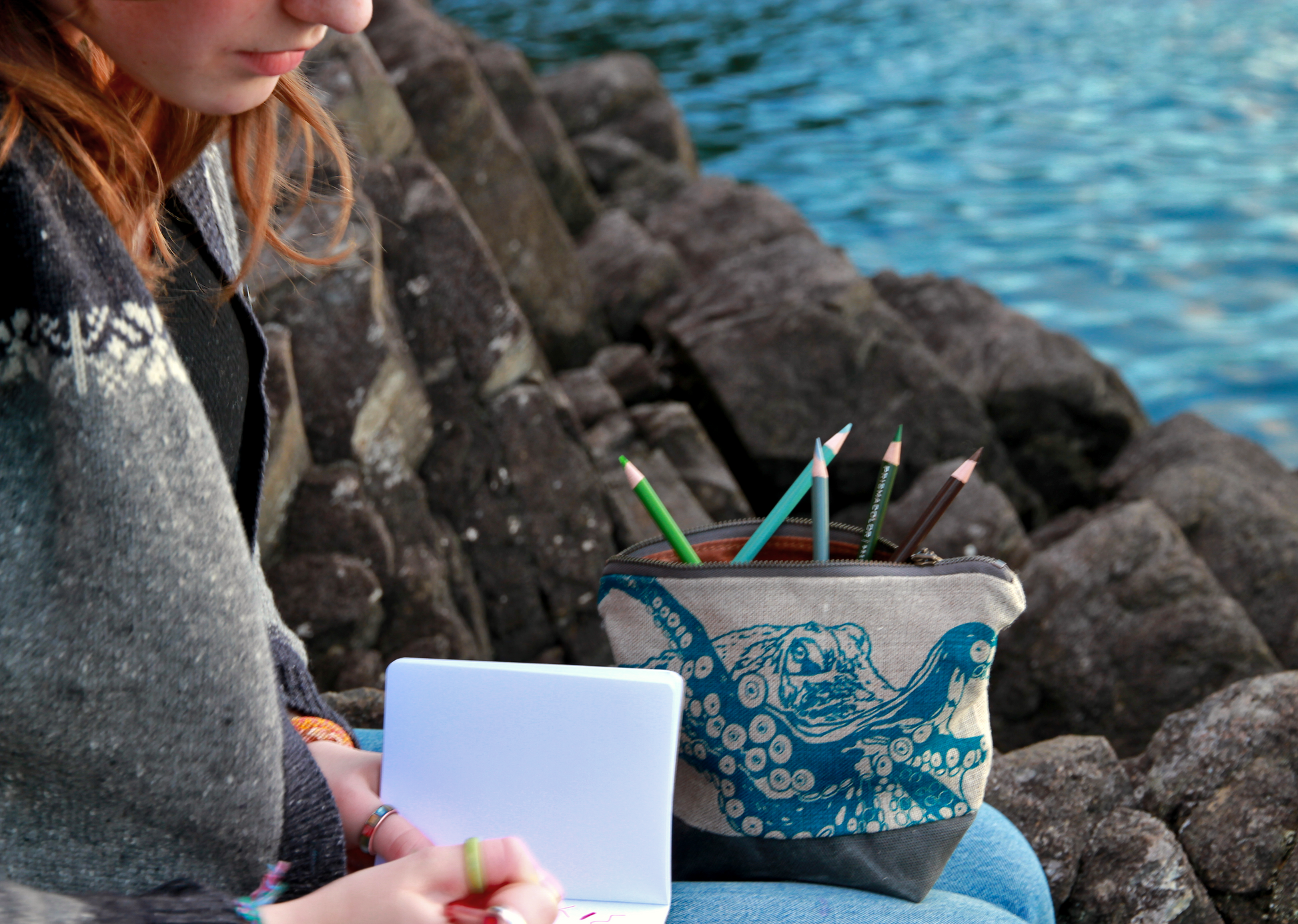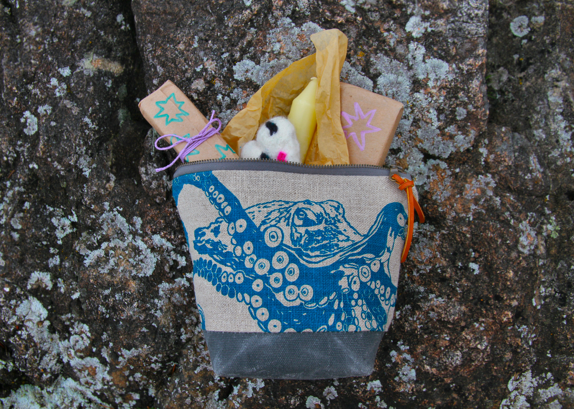 The giant Pacific octopus is the star of the neutral zip-kit, designed and illustrated by Matilda Twigg (age 16). To learn more about the enigmatic wizard, see the card included with the purse, Who is the Giant Pacific Octopus?