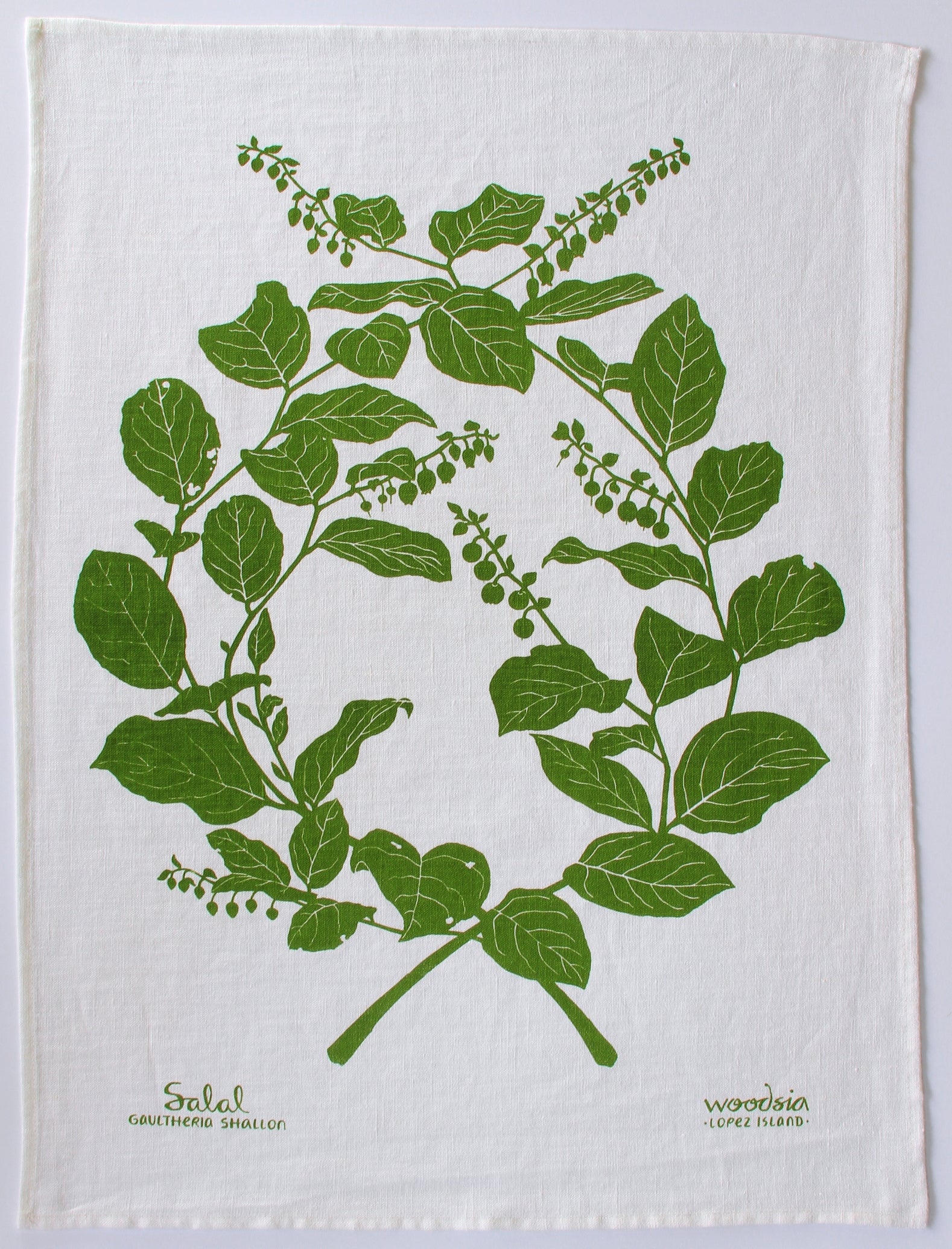 Salal Kitchen Towel in Leaf on White Linen