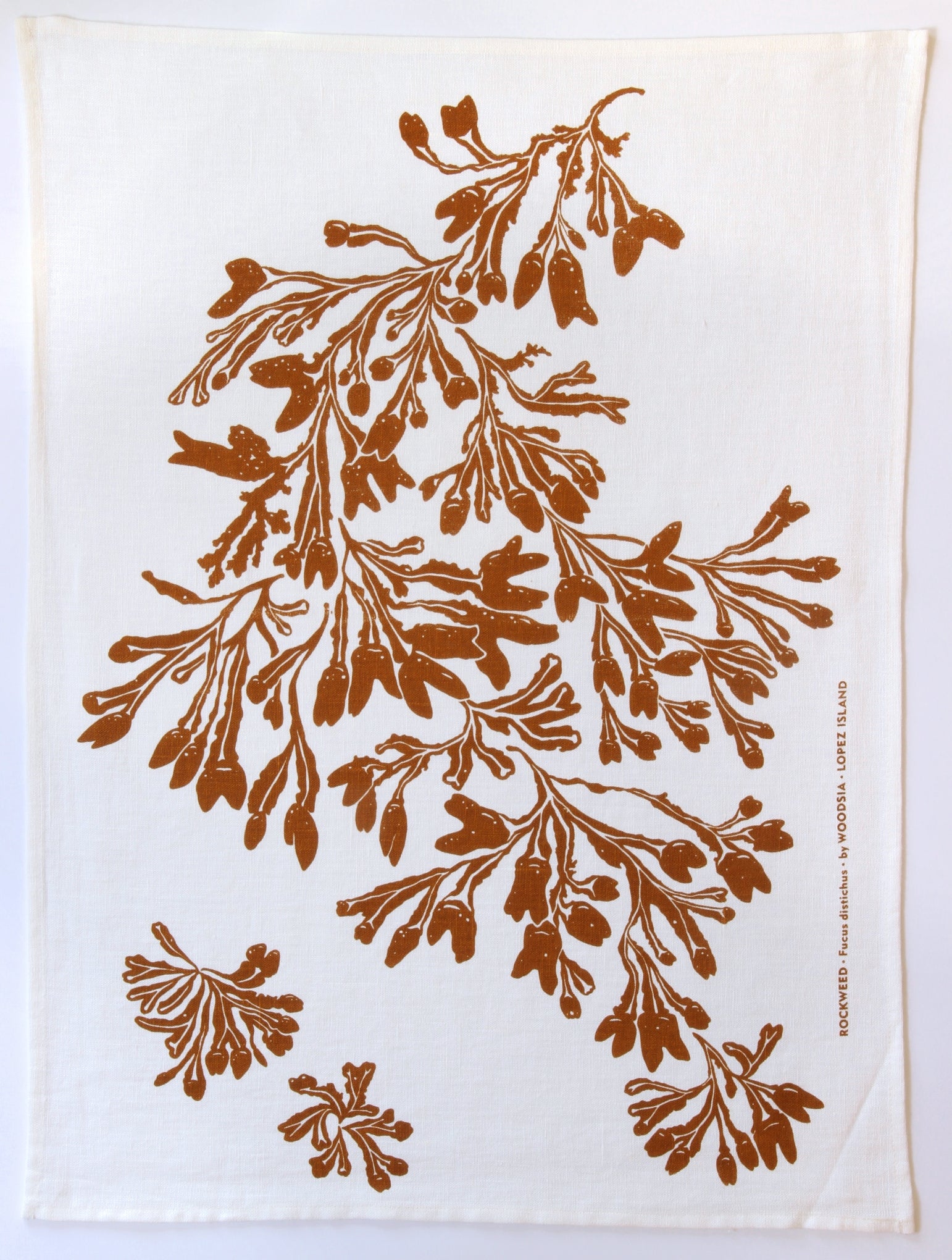Seaweed Fucus Kitchen Towel in Ochre on White Linen