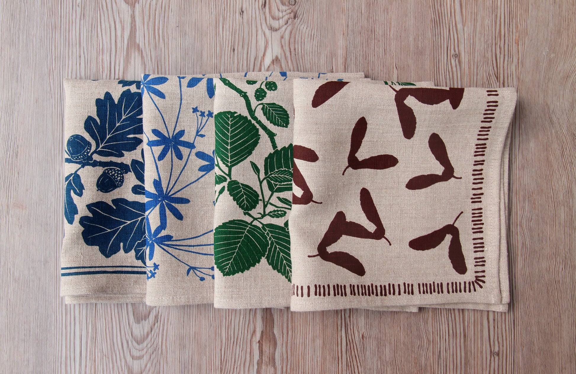 - This napkin set includes 1 Alder in Hunter, 1 Garry Oak in Navy, 1 Bedstraw in Marine, 1 Samara in Brown